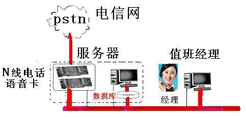 该系统由服务器和值班经理电脑组成.16线并发以下的小系统.服务器和值班经理电脑可以用同一个普通电脑组成.将电话语音卡插到电脑的PCI槽中.装入我公司的电话群呼软件就可以了.服务器直接连接具有反极信号的电话线就可以.