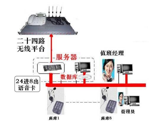 (一)24路无线平台:插上24张无线商话的手机卡.22张作自动拨号的语音群呼. 另两张卡用于接老客户和漏接电话者的来电